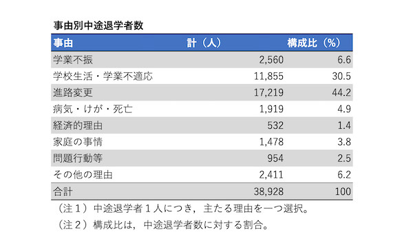 高校中退の主な理由は、「進路変更」と「学校生活への不慣れ」