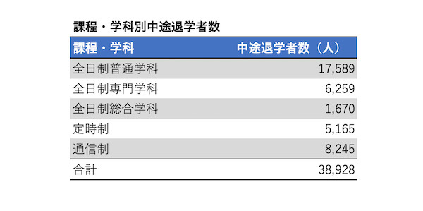 文部科学省の統計によると、令和3年度の高校中退者数は、全国で「約39,000人」にもなります。(出典:文部科学省「令和3年度児童生徒の問題行動・不登校等生徒指導上の諸課題に関する調査結果」)