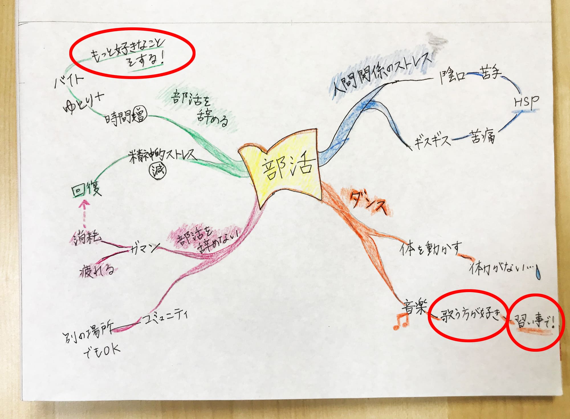 この図では、「ストレス」「悩み」「やりたいこと」などについて思考を広げていった結果、左上と右下の赤い丸で囲んだように、「ダンス部をやめて、学校の外で歌を習う」という解決策に至りました。
