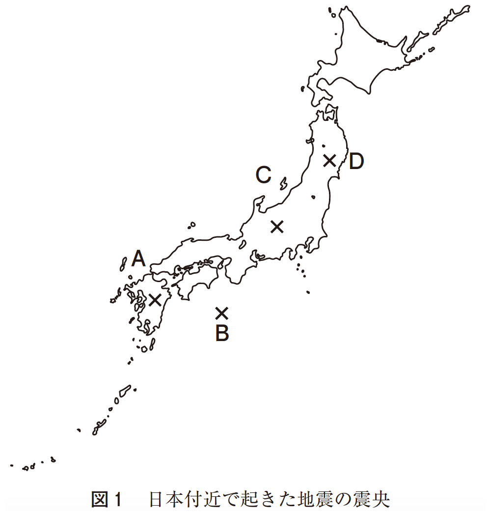 - 図1は過去の日本付近で起きた地震の震央を示している。津波を伴う可能性が高い震央の位置として最も適当なものを、下の①〜④から一つ選べ。