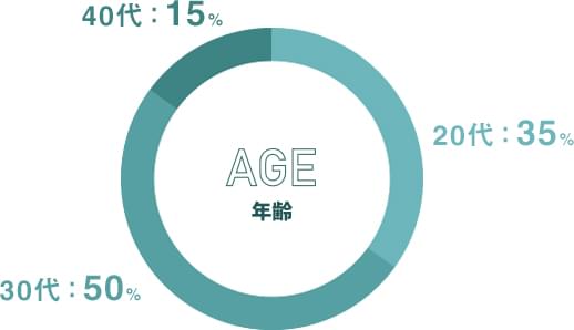 20代が35%、30代が50%、40代が15%です。参考として、2022年現在で一番若い正社員は23歳、一番年長の正社員63歳です。なお、講師アルバイトやパート社員は、10代から60代までとさらに多様です。