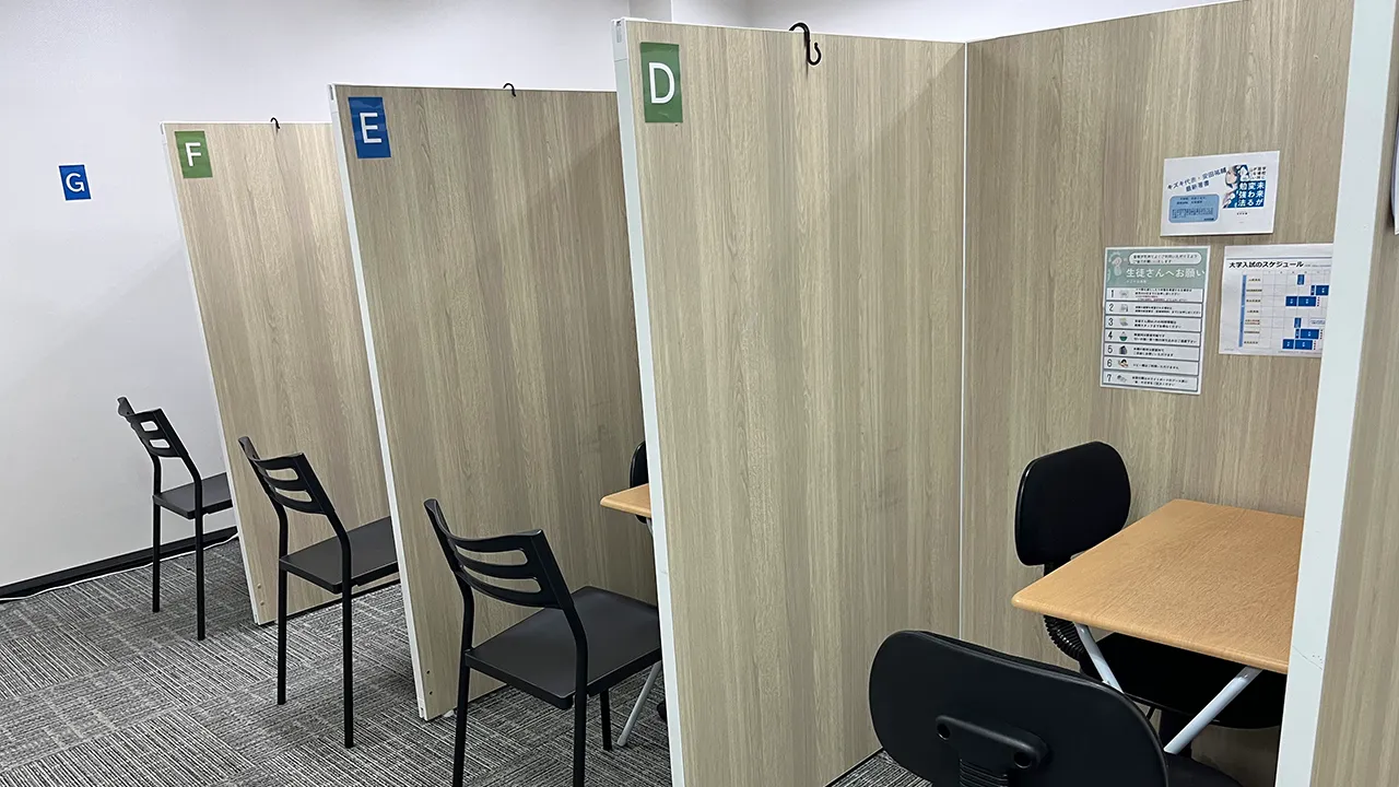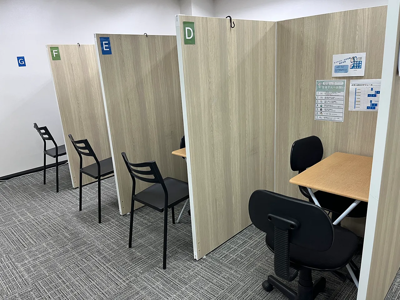 相談のためのスペースがあります。入塾前のご相談はこちらで行います。入塾後も、勉強や進路、生活などについてのご相談をお受けしています。