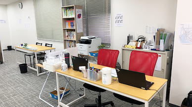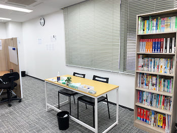 教室は、明るい色を基調とした温かみのある雰囲気です。ビルの2階にあり、オフィス街エリアにあるので、静かな環境で授業が受けられます。