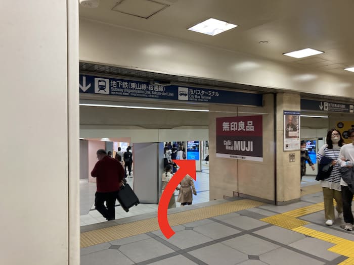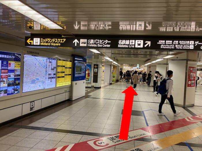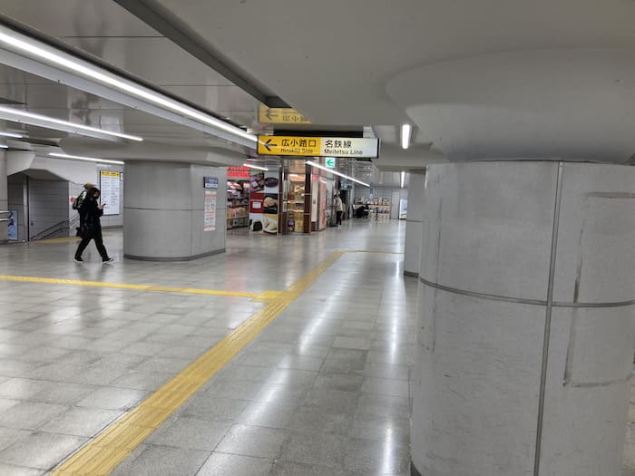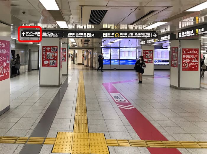 名古屋駅からキズキ共育塾名古屋校へ行くには、まず名古屋駅地下街のSunRoad(サンロード)を目指します。サンロードより先はほぼ直進のみでたどり着けます。