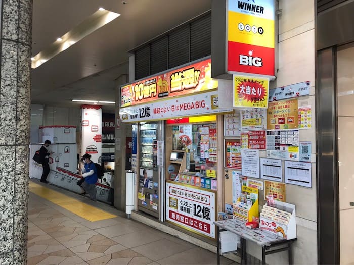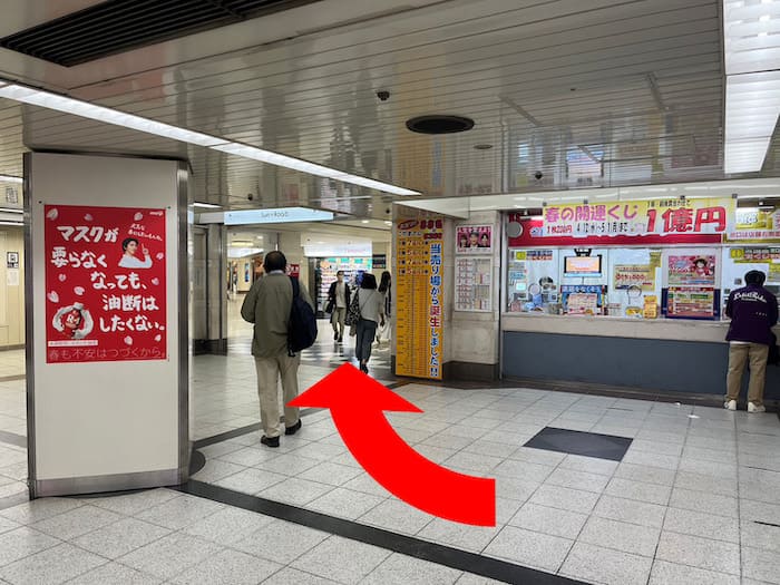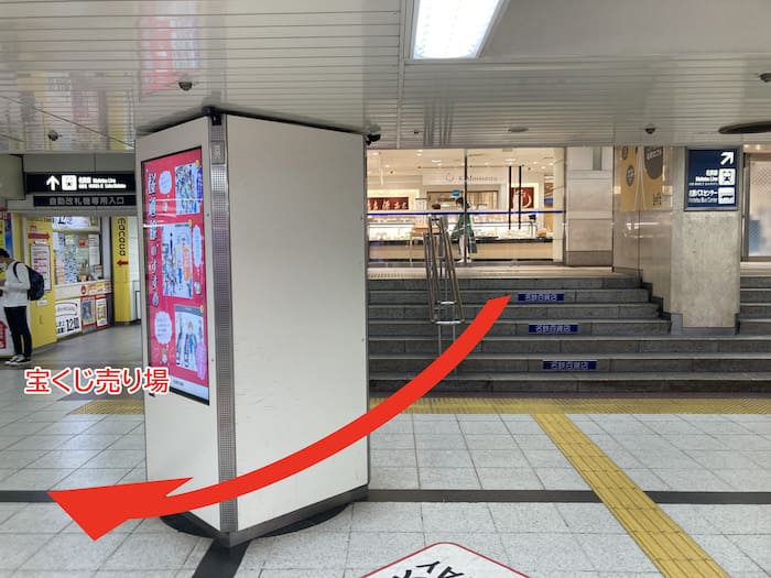• [3]階段を下りて右側に進むと、宝くじ売り場が見えます。【階段上から見た写真】