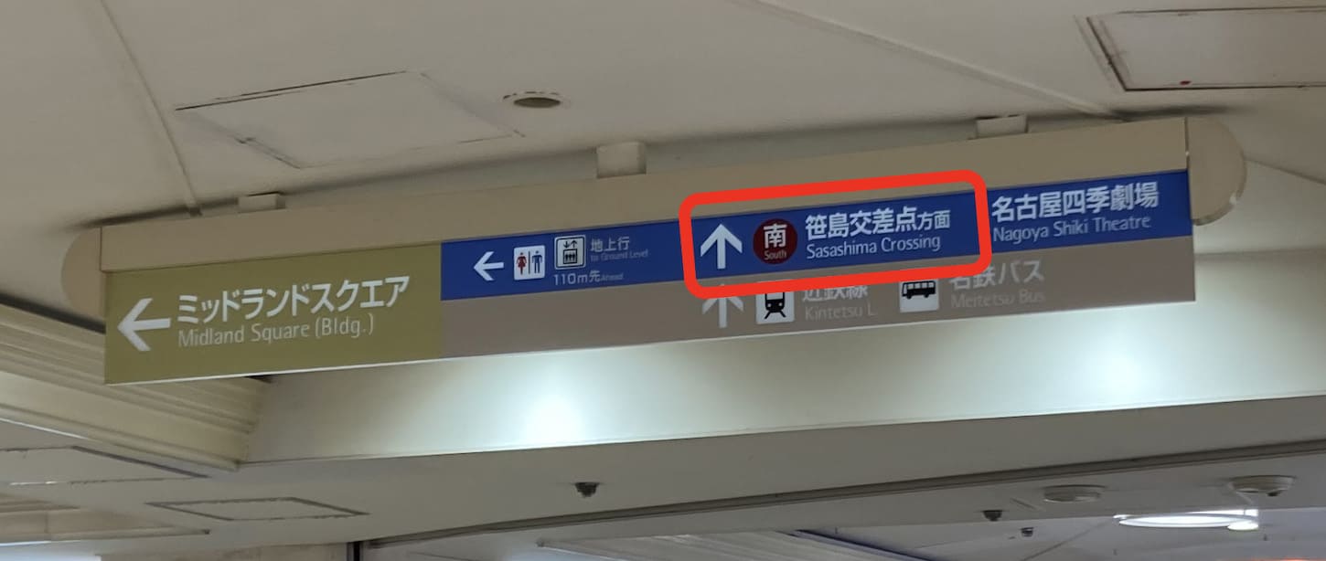 • 正面改札口を出て、正面エスカレーターを下り、Passe(近鉄パッセ)を通り抜けると、サンロードに出るので、サンロードで右へ曲がります。(笹島交差点方面)