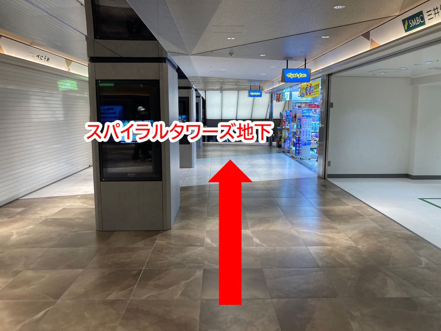 • [3]三井住友銀行ATMで右へ曲がり、スパイラルタワーズの地下通路を直進します。