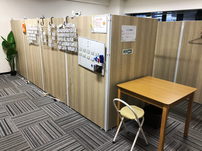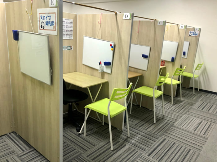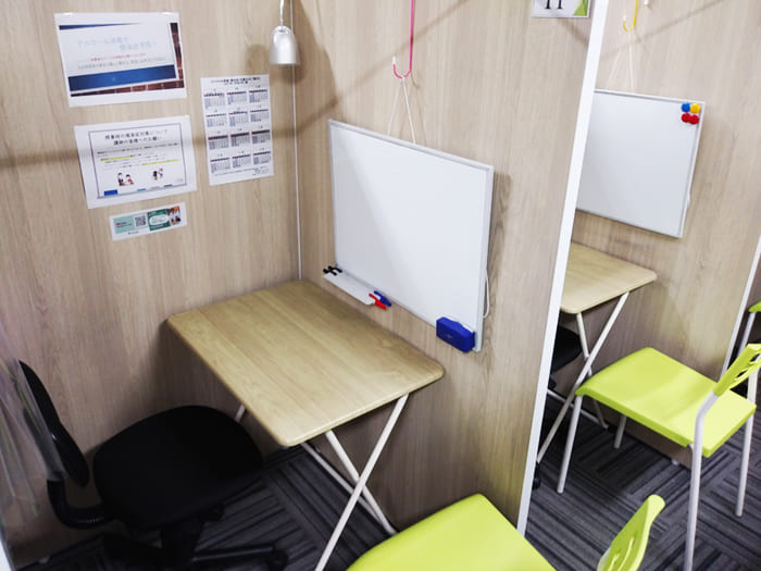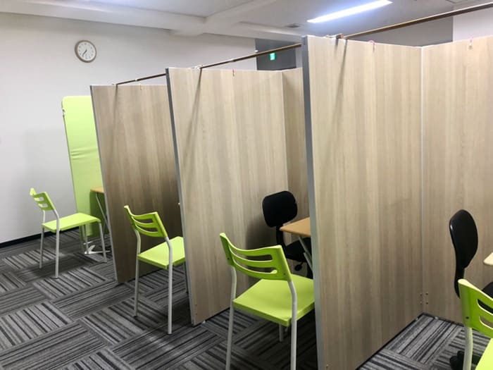 キズキの授業は、講師と生徒さんが1対1となる、完全個別指導です。そのため、授業ブースも一人ひとりのために独立しています。講師と生徒さんの距離が適度に近いため、授業に集中でき、わからないことはすぐに気軽に質問できます。空いているブースは、自習や食事に利用できます。