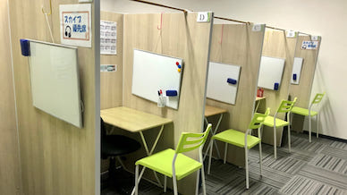 教室は、明るい色を基調とした温かみのある雰囲気です。マンションの2階にあり、繁華街エリアからも離れているので、静かな環境で授業が受けられます。