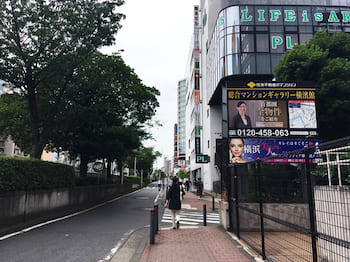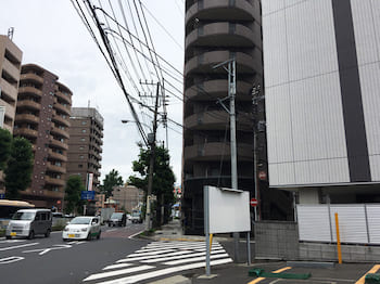 [8]交差点を渡ったら、そのまま上島珈琲店・ローソンが見えるまで直進し、つきあたりを左へ曲がります。