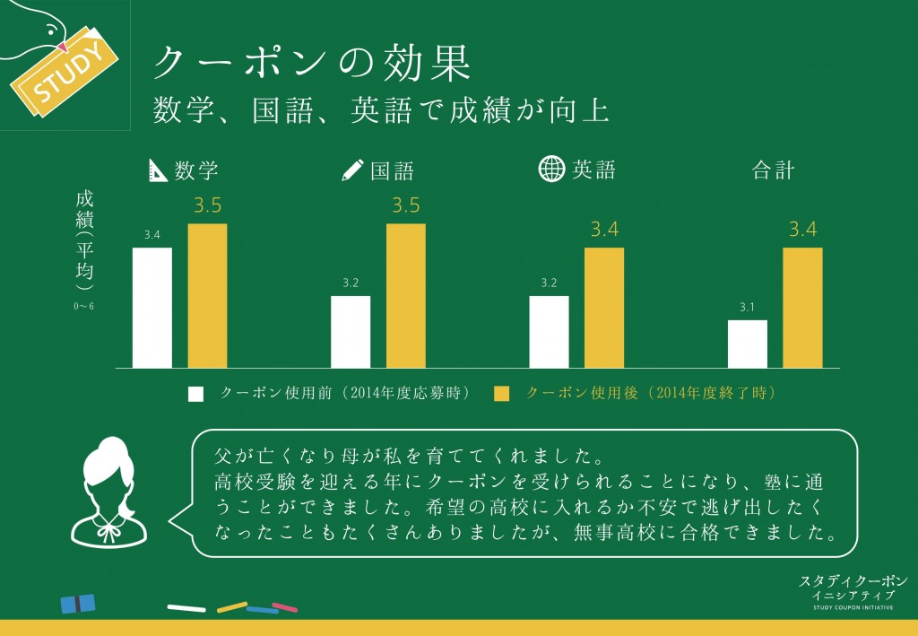 この調査では、子どもたちがクーポンを利用した前後で、数学、国語、英語の成績が向上したことが分かりました。特に、数学と英語の成績については、統計的にも有意に学力が向上したことが分かっています。